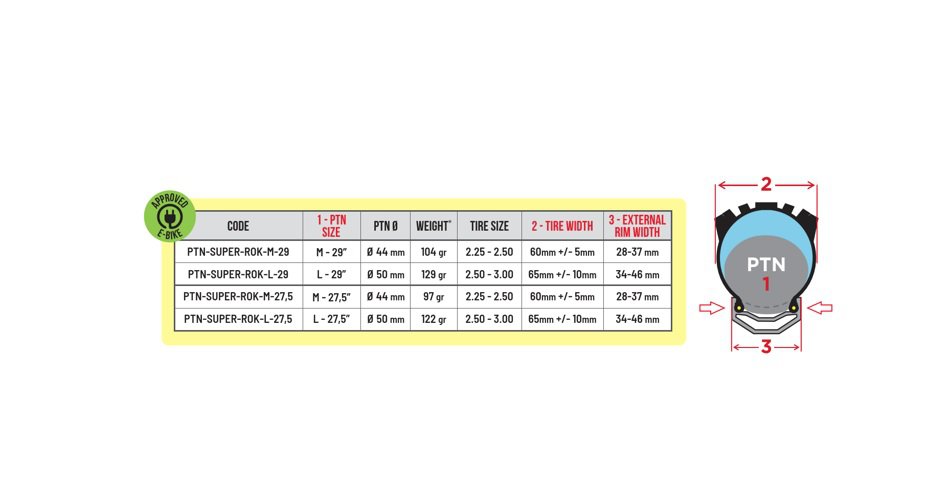 Méretek: M - 29"x2,25-2,50" (Ø 44 mm): 104 g L - 29"x2,50-3,00" (Ø 50 mm): 129 g M - 27,5"x2,25-2,50" (Ø 44 mm): 97 g L - 27,5"x2,50-3,00" (Ø 50 mm): 122 g