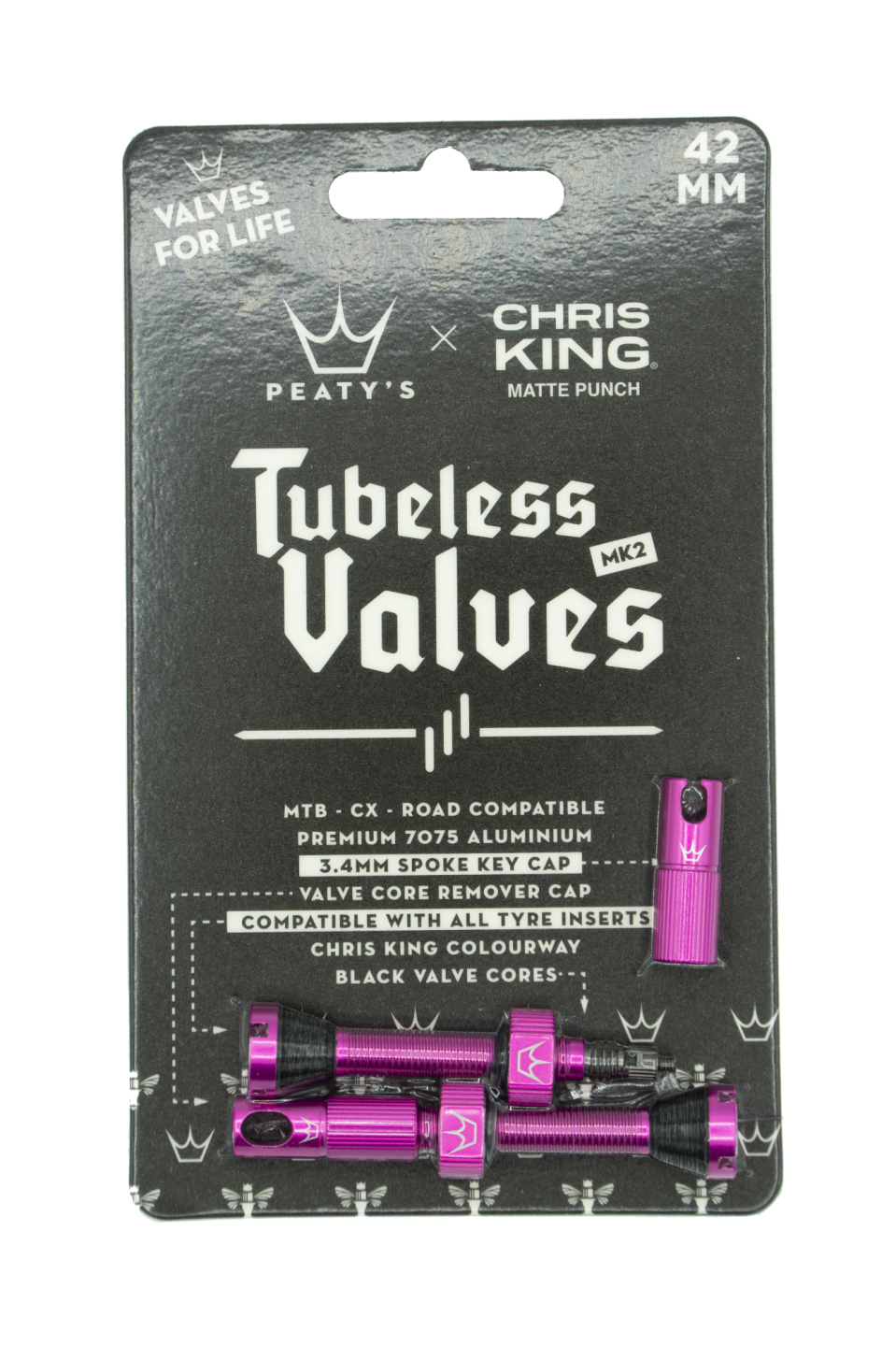 A dizájnnal, a fenntarthatósággal és a minőséggel egészen a lényegig a szelepszíneinkig csak egyetlen vállalattal működhetünk együtt - Chris King! Egy életre szóló szelepjeinkkel és lenyűgöző színeikkel a kerékpárod évekig igazi élvezetet fog jelenteni. A könnyű, nagy szilárdságú prémium 7075 alumíniumból készült Peaty MK2 tubeless szelepek az MTB-től az országútin keresztül a cyclocrossig kompatibilisek legtöbb tubeless rendszerrel, beleértve a karbon, enduro és DH felniket is. Az egyedülálló x-cut talpazatunkat úgy terveztük, hogy minden külső betéttel működjön. A szelep aljába vágott csatornák lehetővé teszik a levegő és a tömítőanyag áramlását, amikor a betét neki nyomódik. A legtöbb egyéb, betéttel kompatibilis szeleppel ellentétben szelepjeink „egyenes” kivitelűek, így nem csökken le a tömítőanyag vagy a levegő áramlása, ha a betét nincs a külsőben. A beszerelés nem is lehetne egyszerűbb. Az integrált O-gyűrű megakadályozza, hogy a záró gyűrű megkarcolja az értékes felnit, miközben a nagy, lágy gumitalp légmentesen tömít. Bringások tervezték bringásoknak. szelepjeink alapfelszereltsége a beépített szeleptű eltávolító és küllőkulcs kupak (a standard 3,4 mm-es küllőanyához). Ez egyszerűvé teszi a laza küllők meghúzását és a tömítőanyaggal való feltöltést, akár a műhelyben, akár az ösvényen. Megzúzódott a gumi tömítő kúp vagy elszakadt egy o-gyűrű? Nem probléma, nézd meg szervizszettjeinket, hogy felújíthasd a szelepjeidet, amikor kereket vagy kerékpárt cserélsz. Szerelési útmutató: (1) Távolítsd el a szelepsapkát, az O-gyűrűt és a kontraanyát (2) Helyezd be a szelepet a felni szelepfuratába (3) Told rá az o-gyűrűt a szelepszárra (4) Tekerd tá a kontraanyát a szelepszárra (5) Kézzel húzd meg kontraanyát, addig, amíg kézi erővel megtudod (6) Csavard fel a szelepsapkát