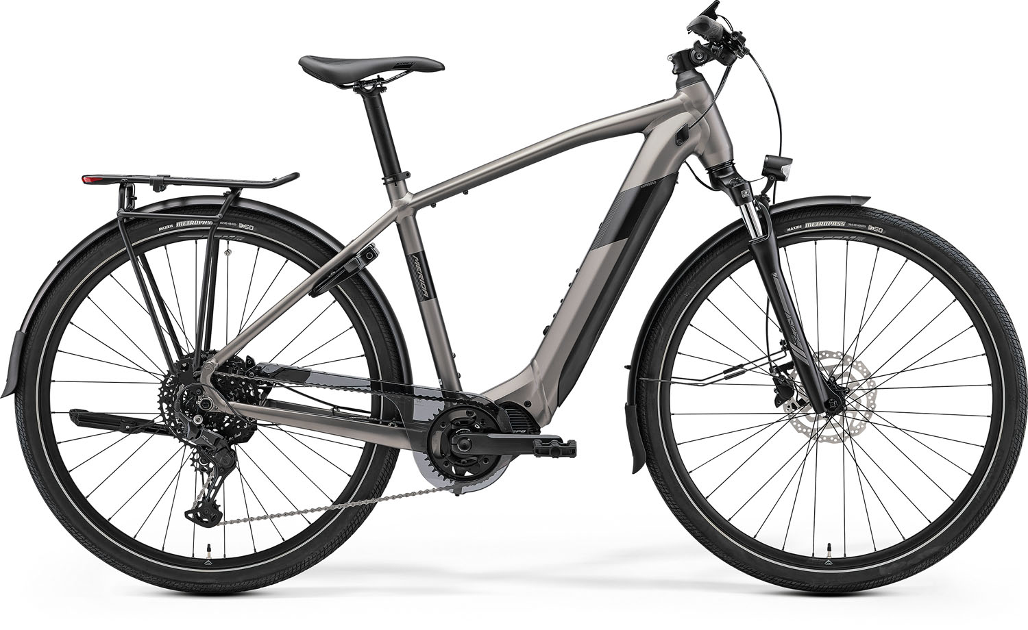 Merida eSpresso 500 EQ Elektromos Trekking Kerékpár - Silk Warm Slate Grey(Black). Specifikáció: Váz:eSPRESSO LITE IV; MAT aluminium; 700x50C (with fender) max. WHS; 142x12 AST; intube, Villa: Suntour NEX E25; Coil; 63 STR; 700x52C max WHS, Első fék: Shimano MT-200; 2 piston, Hátsó fék: Shimano MT-200; 2 piston Első féktárcsa:Shimano RT10; 180 mm, Hátsó féktárcsa: Shimano RT10; 180 mm , Lánc: Shimano LG500 , Első lánctányér: Samox NWP203 ; 38 ATC , Első váltó: , Hátsó váltó: Shimano CUES U6000; GS , Fogaskoszorú: Shimano LG300; 11-48 ATC; 10 GER , Pedál: VP VPE-891 , Markolat: MERIDA COMP TK , Kormány: MERIDA COMP CC; MAT aluminium; 660 WHB; 15 RHB, Kormánynyak: MERIDA EXPERT CT; MAT aluminium; 31.8 DSH; adjustable, Kormánycsapágy: MERIDA-8156, Első agy: Shimano QC300; 100x9 WHF; 32 SPH; Centerlock, Hátsó agy: Shimano TC500-HM; 142x12 WHR; 32 SPH; Centerlock , Felni: MERIDA COMP TK; 20 IWR; MAT aluminium , Nyereg: MERIDA EXPERT TK II; V-mount, Nyeregcső: MERIDA EXPERT CC; MAT aluminium; 34.9 DSP; 0 SSB, Váltókar: Shimano CUES U6000-10, Külsőgumi: Maxxis Metropass; 28x2.0; wire; reflecting line, Csomagtartó: MERIDA MIK HD Carrier with Spring clip & Spanninga rear light, Sárvédő: Sunnywheel SW-FA311-60E1 (MSB), Kitámasztó: Massload CL-KA98, Első lámpa: Herrmans H-Black MR4 E, Hátsó lámpa: Spanninga Commuter Glow XE integrated in MERIDA MIK HD carrier, Motor: Shimano EP6; 85Nm, Akku: Shimano EN806; 630Wh , Akkutöltő: Shimano EC-E6002; 2A charging current , Kijelző: Shimano SC-EN610