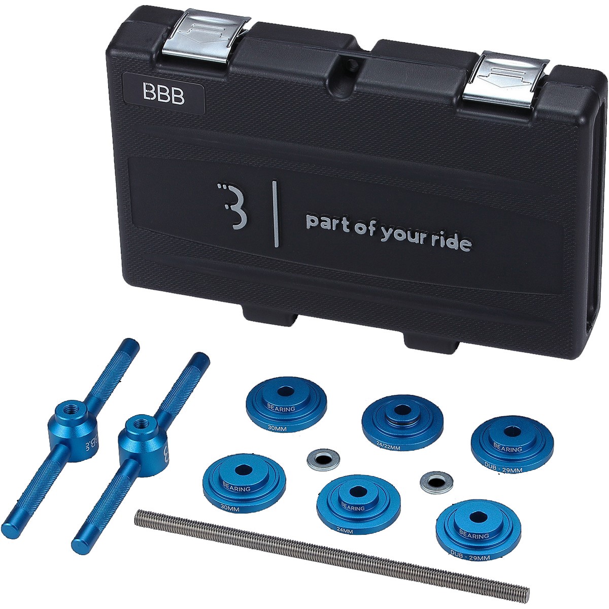 BBB BTL-231 Bearing Press Set Középcsapágy Lehúzó Szerszám Alumínium csapágybehúzó készlet Kompatibilis minden 22/24/29/30 mm-es tengely szabvánnyal A kétoldalas CNC megmunkálású nyomólapok tökéletesen illeszkednek a csapágycsészékre és a csapágyakra Az összes (szervizelhető) BBB-középcsapággyal kompatibilis Luxuskivitelű, eltolt kényelmes markolatok a kényelmes használatért A 240 mm hosszú menet bármilyen középcsapágy-szélességhez illeszkedik Kiváló minőségű doboz a tároláshoz és szállításhoz