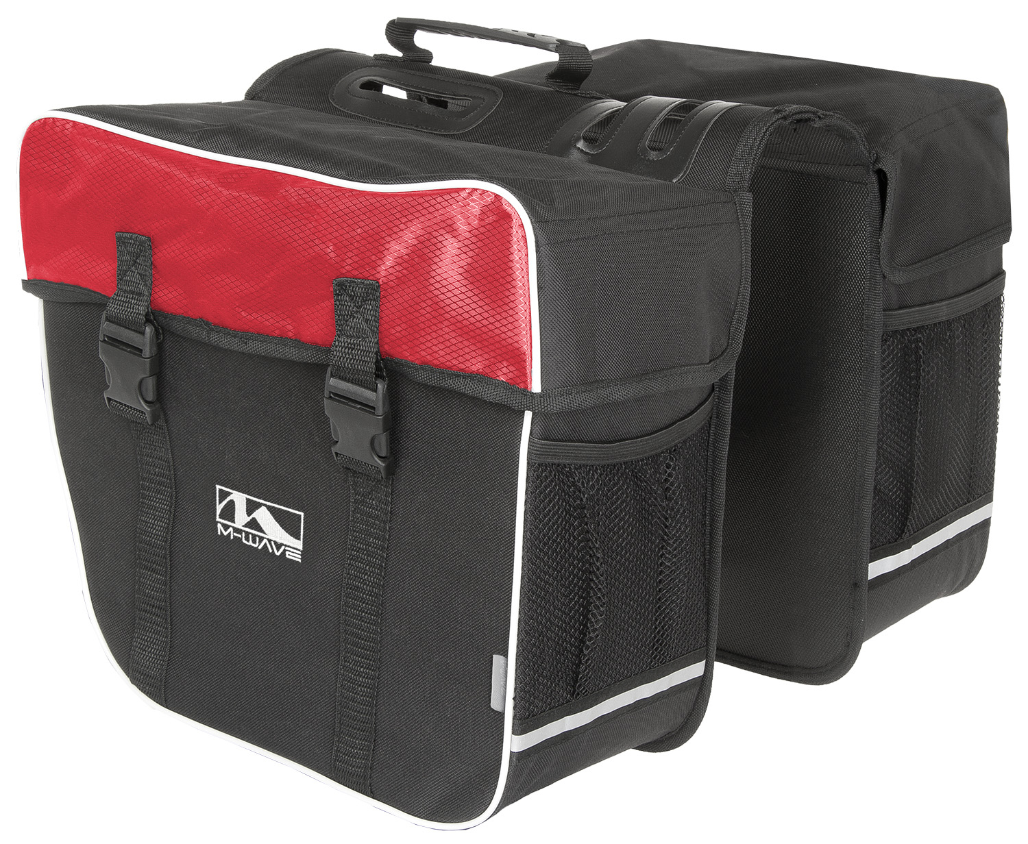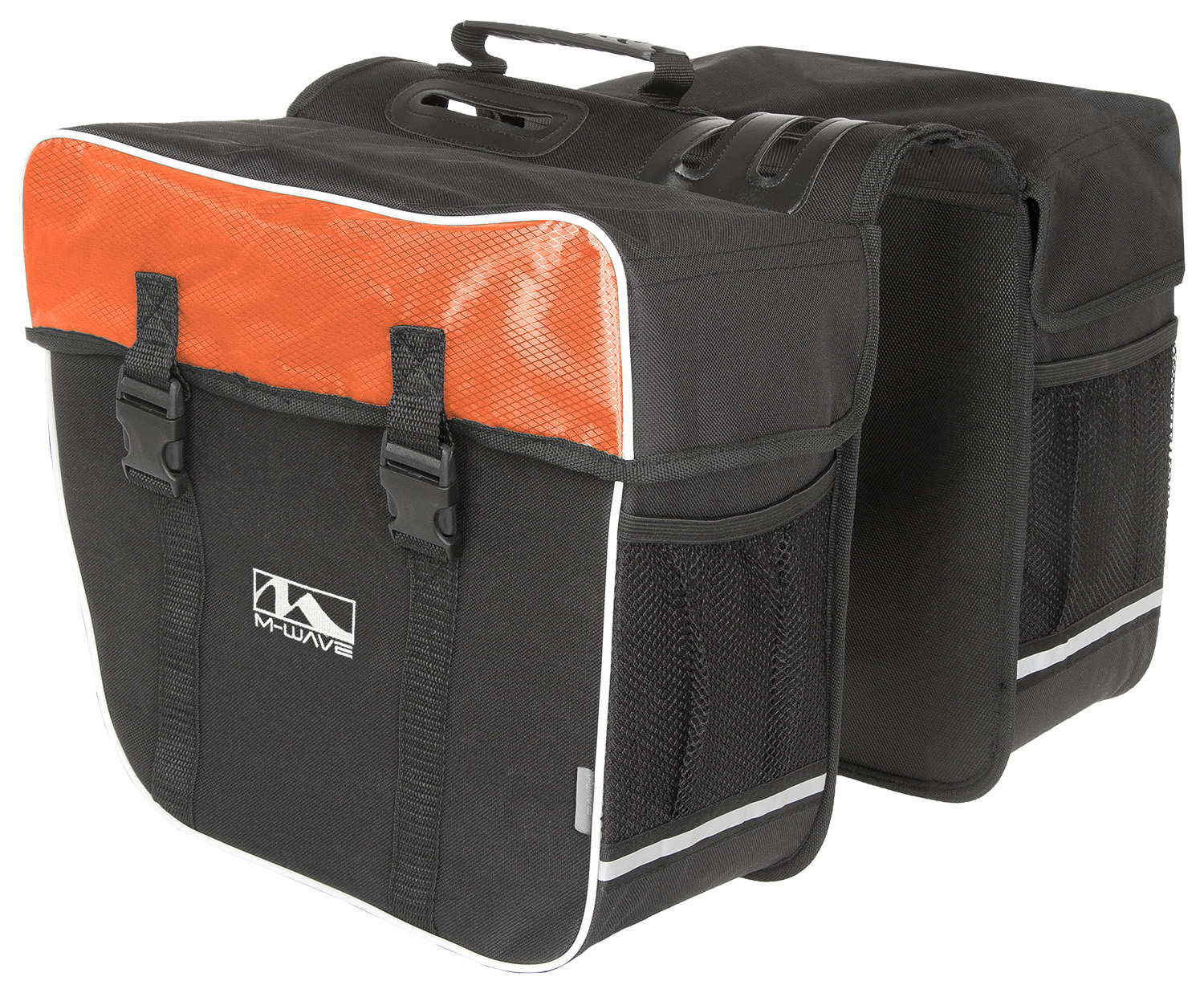 M-Wave Amsterdam Túratáska Kétrészes túratáska 600D szakadásmentes anyagból. Oldalanként 30 literes, 34X17X30cm. Műanyag merevítő betétek a jobb tartásért, hordozófüllel, fényvisszaverő csíkokkal, három gyors csat a rögzítéshez..