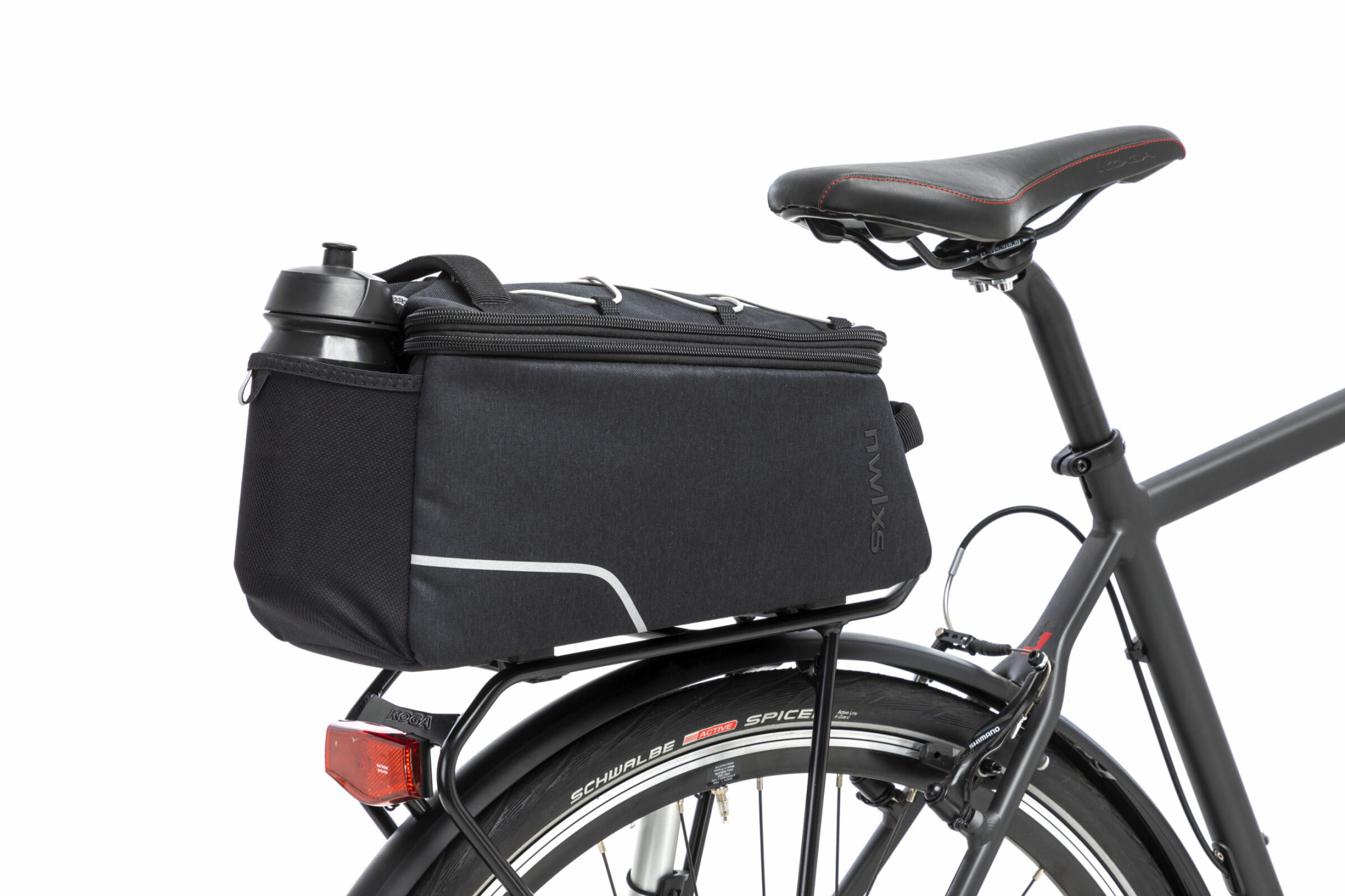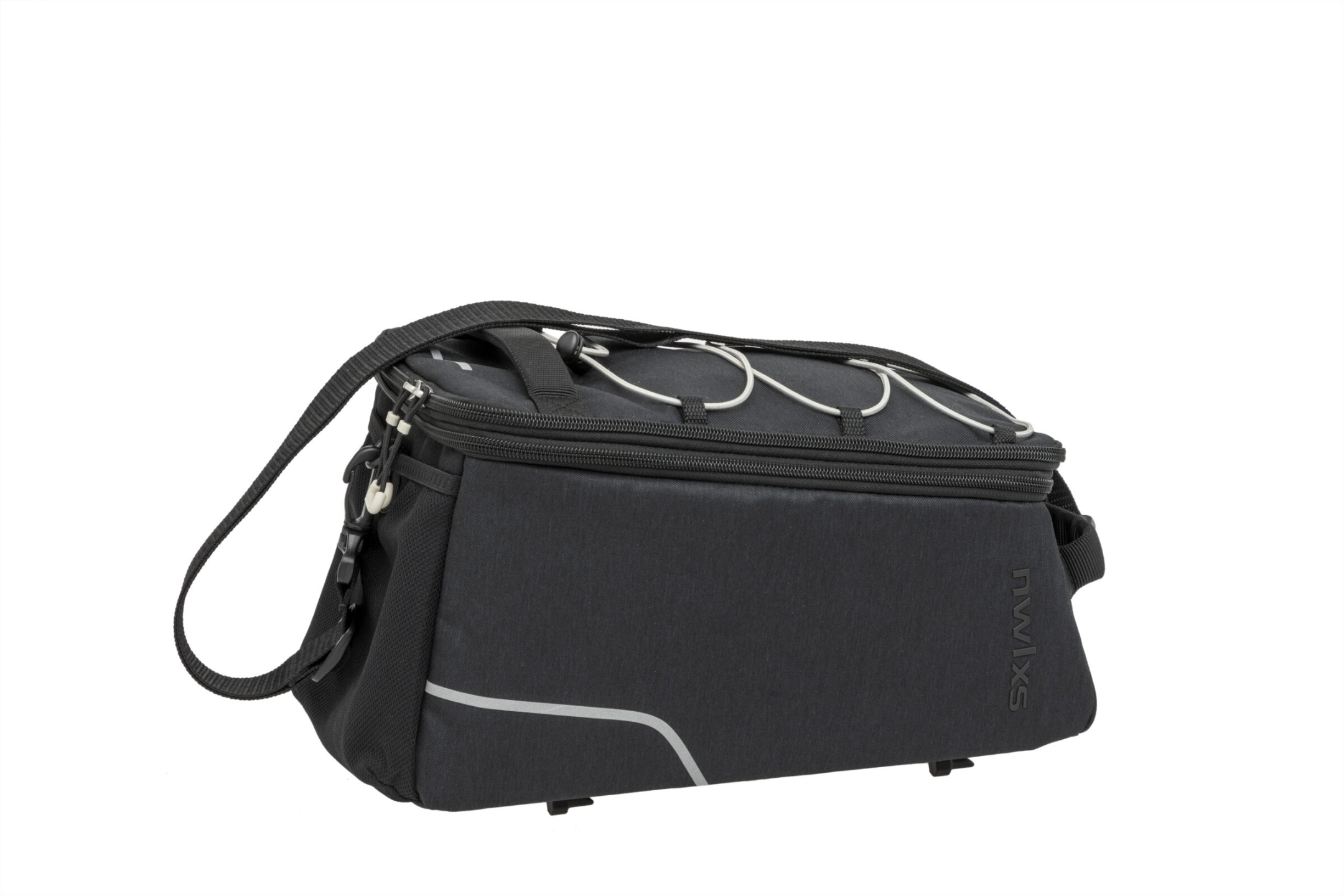 NewLooxs Sports Small Racktime Túratáska A Sports Trunkbag egy praktikus túratáska, három belső rekesszel, valamint palacktartóval a hátulján. A táska Racktime Snapit adapterrel rögzíthető a Racktime csomagtartóra. Egyszerűen, egy kattintással feltehető/levehető. Fényvisszaverő csíkokkal rendelkezik a nagyobb biztonság érdekében. Esővédő, vállpánt tartozik hozzá. Súly: 1 kg. Térfogat: max. 14 liter. Mérete: 34 x 19 x 27 cm.